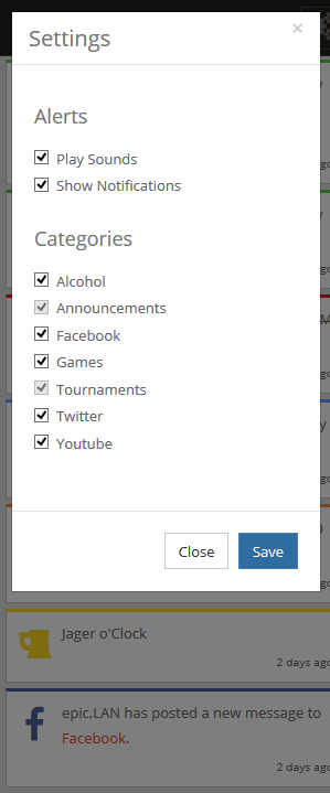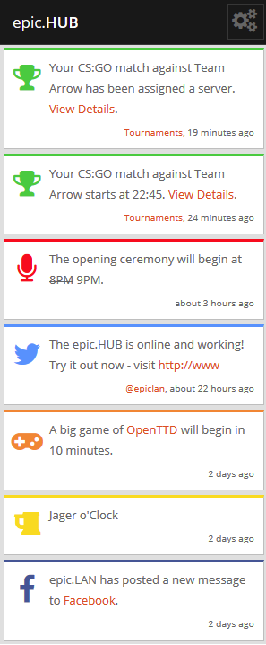 It's completely configurable, you can opt-out of any of the categories, turn off sounds or even turn off the notification popups altogether. It ties in completely with your epic.LAN event account. If you're taking part in one of our tournaments, it'll tell you when your match is due to start, with a link to go straight to the match details. It'll even tell you the server you're meant to be playing on!